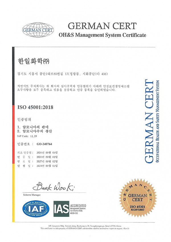 한일화학(주) ISO45001:2018 인증(2024년09월03일)