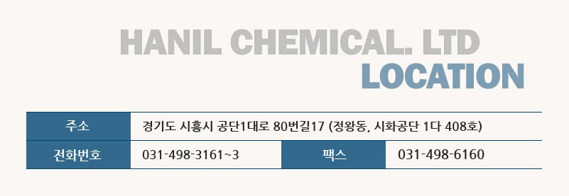 한일화학㈜ 경기도 시흥시 공단1대로 80번길 17(정왕동, 시화공단 1다 408호) 대표번호 : 031-498-3161 이메일: khbae@hanilchem.kr 팩스번호: 031-498-3160